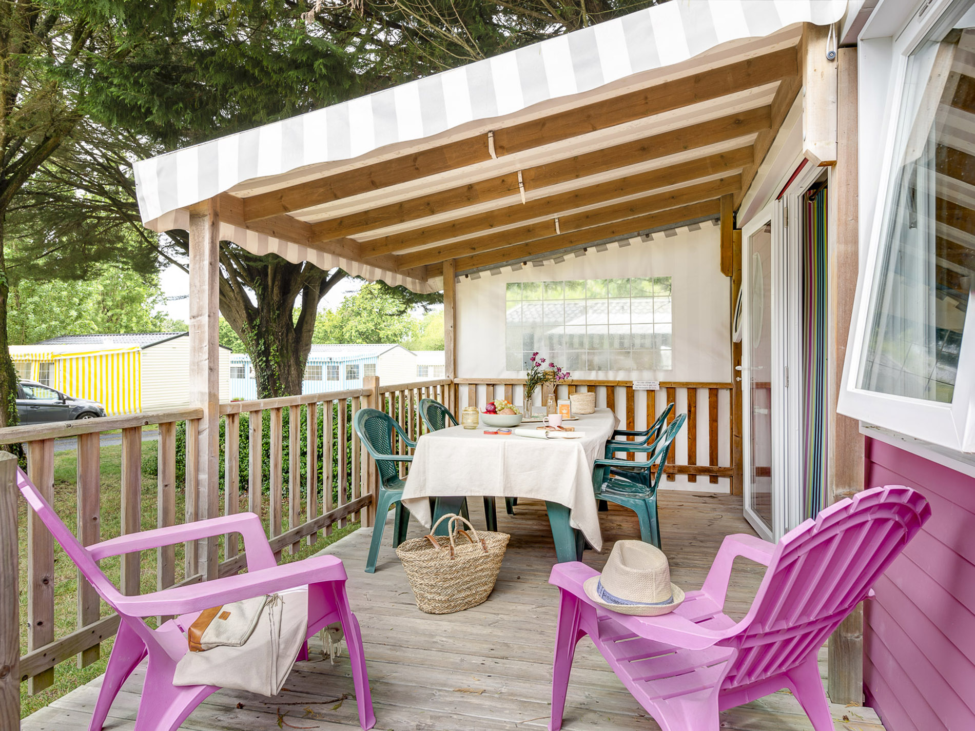 Mobil-home avec terrasse, équipement standard, idéal pour passer un agréable séjour.
